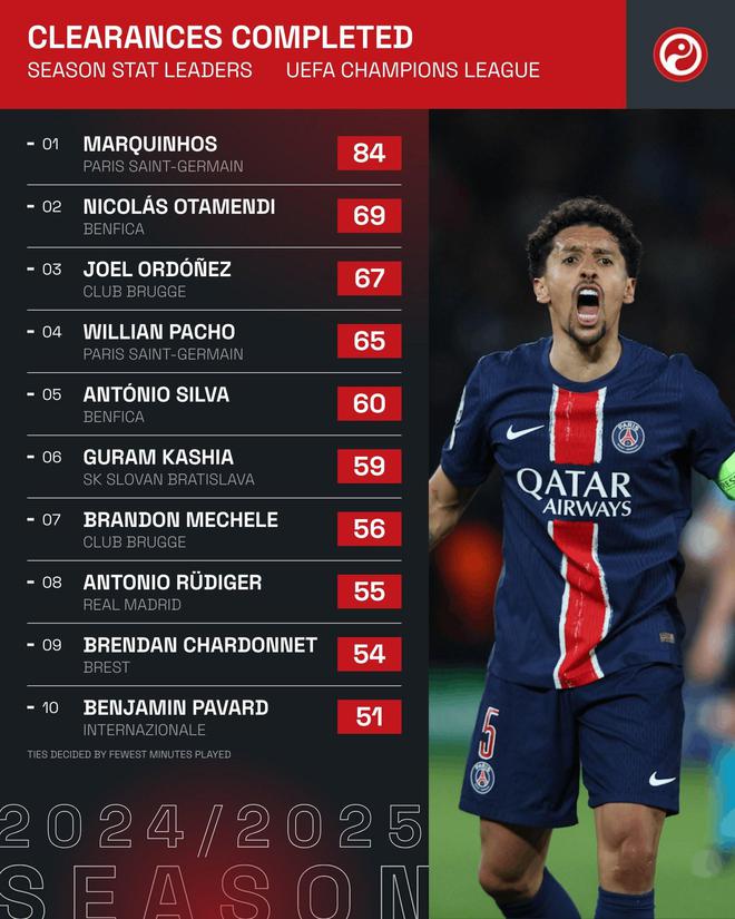 24/25赛季欧冠解围榜:马尔基尼奥斯92次断档领先,帕乔72次居次席